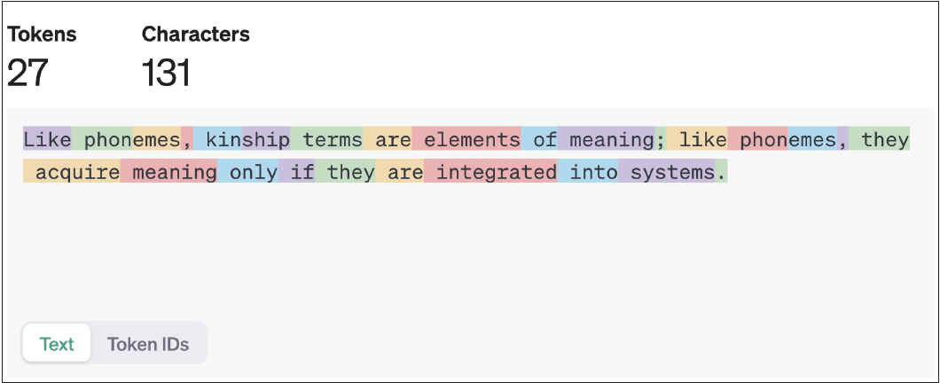 Large Language Models wie ChatGPT werden mittels eines Korpus an Worten trainiert, welche zu sogenannten Token, das sind Wortteile, heruntergebrochen werden. Bei heutigen Modellen sind das etwa fünf bis sechs Billionen Token, die in den Trainingsdaten in unterschiedlichen Sequenzen (Sätzen) auftauchen. Aus all diesen verschiedenen Kontexten werden Beziehungen zwischen den jeweiligen Wortteilen hergestellt. Das Modell wird also nicht darauf trainiert, die Bedeutung eines Wortes (oder Tokens) zu lernen, sondern das Wort im Verhältnis zu allen anderen zu verstehen.4 Die Vorhersage des nächsten Wortes eines Satzes lässt sich demnach nur aus dieser Gesamtheit an Beziehungen gewinnen, das heißt der Sprache als Totalität – oder eben dem Modell davon.