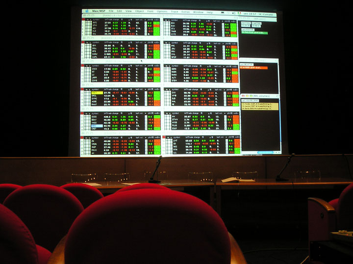 At the apex of the economy, the stock exchange represents the virtuality and volatility of capital, and at the same time its greatest expression in terms of the collective imaginary. The fate of entire economies is decided »there«; no hyperbole when you consider how Iceland’s whole economy was destroyed in a few weeks by the market crash. This »extra-territory«, where a few hours hectic activity, driven by so many unpredictable variables, is able to move astonishing amounts of money, has always tickled the artist’s imagination. Aernout Mik’s »Middlemen«, with its surreal »tableaux vivants« depicting scenes of stockbrokers, is a classic expression of this phenomena (and frighteningly prescient of the stock exchange crash, when made seven years ago). And where Claude Closky’s »Untitled (NASDAQ)«, is a wallpaper showing the flood of data generated by stock market activities, Fabio Cifariello Ciardi’s »A Bid Match« is a conversion across data domains (from stock values to sound) derived from Sotheby’s NYSE stock value on the 15th September 2008 – the first day of the Damien Hirst auction.