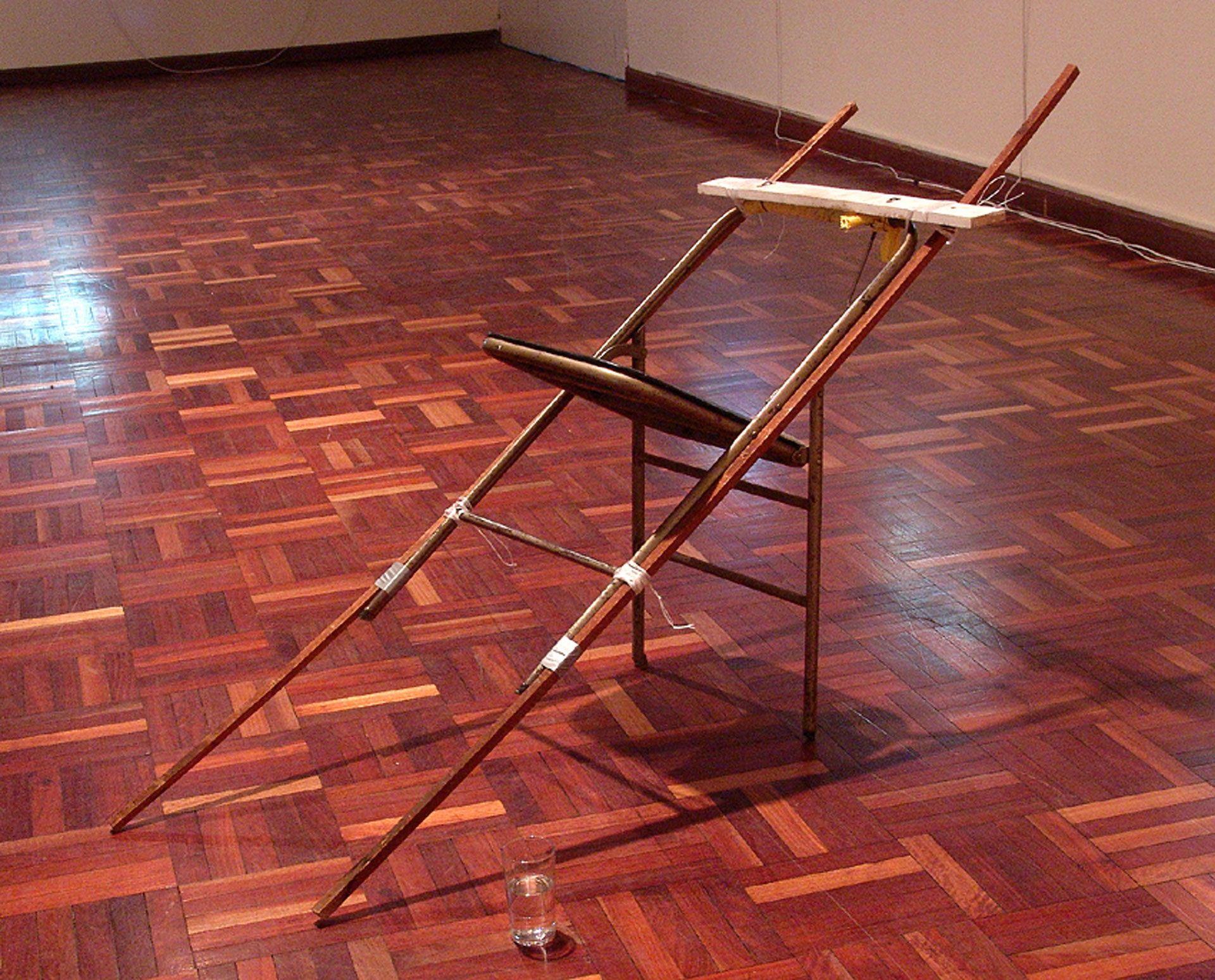Carlos Capelan’s sculpture (» My House is Your House «) (2005) is a stark reminder that hospitality is not unlimited hotel service. Capelan’s installations have repeatedly used the chair and a glass of water as a symbol of the minimum offering we can make to strangers. As part of his exhibition (» Only You «), at the National Gallery of Uruguay, he tied two stakes to the legs and back of an old fold-up chair. These prosthetic legs transform the chair so it resembles a tent frame, but the sculpture also carries the more sinister echo of a body thrust rigid by shock treatment. The invitation to share a house is a precarious gesture, for it splices the guest’s acceptance onto the host’s tensions.