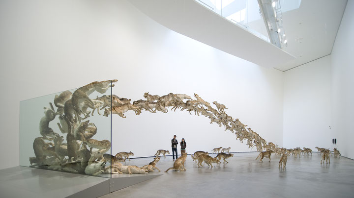 The work is an installation presenting 99 wolf replicas running head on into a glass wall. This visually impressive work urges the viewer to look twice inquiring into its reality. The work has a dramatic ring to it, in that this pack of wild animals struggle in vain trying to break through a glass wall that stands within the white walls of the museum. There is a correlation between the power of leaping wolves and their subsequent pain. This scene which is re–animated in a sterilized exhibition hall forces the audience to experience an intimate moment. It must be a feeling like that, which pushes the Internet user to like and share the photo of a work of art. It is a visual correlation that the viewer is forced to establish. It is a drama produced by reality that replaces abstraction. That is to say, it is comparable to the portrait of a weeping child hung on the wall with a teardrop on his cheek.